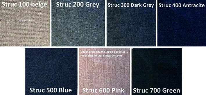 STRUC: 100 beige - 200 grey - 300 dark grey - 400 antracite - 500 blue - 600 pink - 700 green
