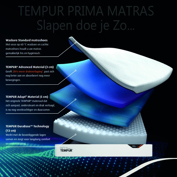 TEMPUR PRIMA matrassen zijn allemaal voorzien van een comfortabele toplaag. De lagen daaronder zijn gemaakt van het unieke TEMPUR materiaal dat zorgt voor een perfecte ondersteuning van uw lichaam.
